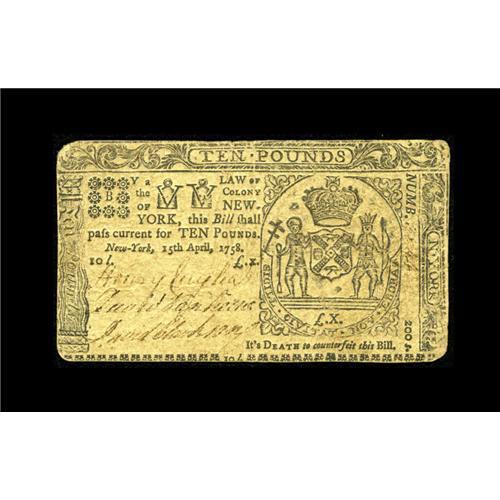 New York April 15, 1758 $10 Choice Very Fine. This is