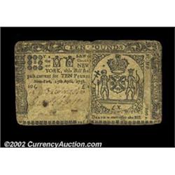 New York April 15, 1758 $10 Very Fine. There is a tape stain on the blank back where the center fold had been reinforced, but the tape is now gone, and the note is holding together quite nicely without it. The New York Coat of arms is very sharp on this well-printed example. Important notice: We expect to be auctioning lots at the rate of 200-250 per hour. Sometimes eBay Premier live bid software cannot keep up with that pace, so we strongly recommend that you place a realistic proxy bid now as insurance to avoid disappointment. Also please note that all Heritage/CAA lots purchased through eBay Premier carry a 20% Buyer's Premium. Please make sure you read the Terms and Conditions.
