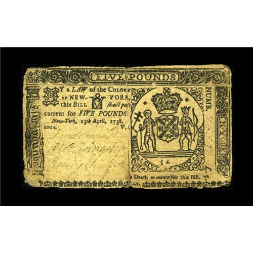 <B>New York April 15, 1758 $5 Fine.</B></I> This is only the fourth example of this note in our over 40 catalog auctions. All three signatures remain and there is a reinforced center split. Rare, underappreciated, and highly undervalued.<BR><BR><b>Shipping:</b> Coins & Currency (<a target="_blank" href="http://www.heritageauctions.com/common/shipping.php">view shipping information</a>)