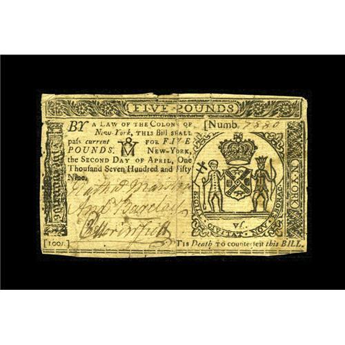 New York April 2, 1759 $5 Very Fine. Some minor restor
