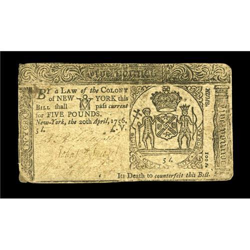 <B>New York April 20, 1756 L5 Very Fine-Extremely Fine.</B></I> Listed in Friedberg with a price only in the VG column and "rare" in the VF column. This is the second finest example that we've handled of this note in 40 years of dealing in currency. A very important early date New York piece.