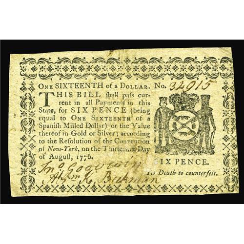 New York August 13, 1776 $1/16 Very Fine-Extremely Fine New York August 13, 1776 $1/16 Very Fine-Ext