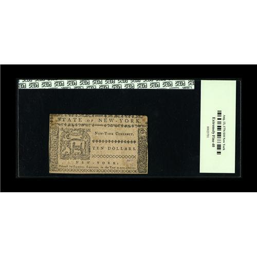 New York August 13, 1776 $10 PCGS Extremely Fine 40. A