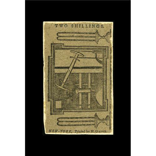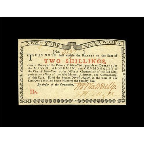 <B>New York August 2, 1775 (Water Works) 2s Very Choice New.</B></I> A near flawless example with broad, even margins, bold signatures, ideal color, and excellent centering of both sides. This issue was printed on two separate pieces of paper that were mounted together prior to printing. The face is on a fine light paper and the back on a coarse, darker paper. Gaps, peels and all sorts of problems are caused by this mounting, making the hunt for pristine notes daunting. This one is just short of that goal.<BR><BR><b>Shipping:</b> Coin/Currency (<a target="_blank" href="http://www.heritageauctions.com/common/shipping.php">view shipping information</a>)