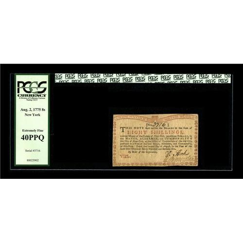 <B>New York August 2, 1775 (Water Works) 8s PCGS Extremely Fine 40PPQ.</B></I> This red and black issue exhibits a couple of folds and a small stain on the back, but faces up nicely in the third party holder.<BR><BR><b>Shipping:</b> Coins & Currency (<a target="_blank" href="http://www.heritageauctions.com/common/shipping.php">view shipping information</a>)