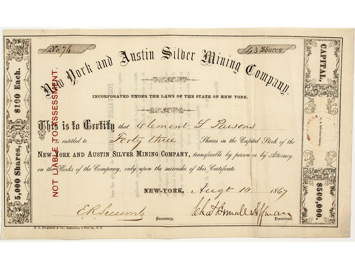 c1867 This is a stock certificate issued by the New York & Austin Silver Mining Company. It is issued to Clement Parsons for 43 shares. Rare. - HKA#65699