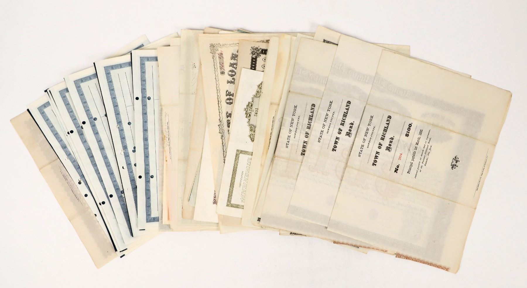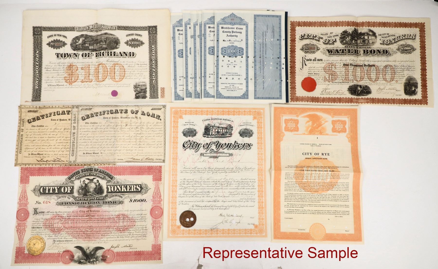 38 New York Bonds c.1863-1971 includes bounty bonds, payment of volunteers, Albany, NYC, Yonkers, City of Rye, Westchester County Sandy Creek, Richland, Town of Solon. 14 different. Nice variety with early bonds.