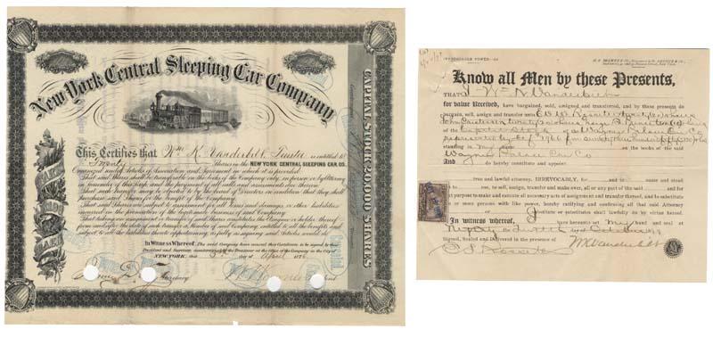 1876, New York. Stock certificate for 20 shares of the New York Central Sleeping Car Company. Black. Vignette of a steam locomotive at center. Litho. Issued to and signed on accompanying stock proxy by William K. Vanderbilt. WILLIAM K. VANDERBILT (1849-1920). Railroad executive; Second son of William H. Vanderbilt. William began his career in railroading at the age of nineteen in his grandfather's office ("Commodore" Vanderbilt), and was heavily involved in the family railroad empire for the remainder of his life. Stamp and punch cancellations not affecting signature. Extremely Fine.