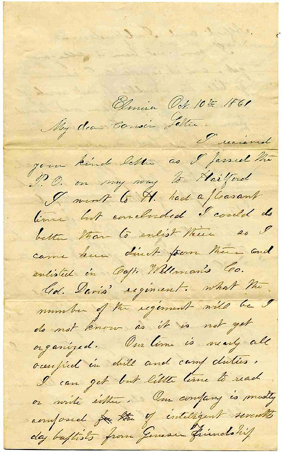 Letter from Edgar W. Irish of the 85th New York Infantry, Company C. Accompanied by cover. Datelined Elmira, New York, 10 October 1861, three days after Irish mustered into service. Excerpt: ''...My Dear Cousin Lottie...I came here direct from there and enlisted in Capt. Wellman's Co., Col. Davis's regiment...Our time is nearly all occupied in drill and camp duties...Our Company is mostly composed of intelligent seventh day baptists from Geneva, Friendship, Alfred and Independence...Have not heard from home since I came from there a week ago last Tuesday. I guess you may as well take care of that likeness and the cake you spoke of til some other time - til the war is over for instance which I confidently believe will be the case within a year at the fartherest. I think that if you should go to the seat of war you would find it quite as rough and perilous as you could endure. I hope you will have no occasion to go. I wish I had not too for I dread it...Pray for me Lottie that I may not falter in my duty to God or man...'' The 85th New York was engaged at Yorktown, Williamsburg and Fair Oaks. In April 1864 nearly the entire 85th New York Infantry was taken prisoner at Plymouth; 222 of the men later died in southern prisons. Irish mustered into Company C on 7 October 1861 and mustered out on 20 June 1865. Letter measures 5'' x 8'' and runs 2.75pp. Fine condition.