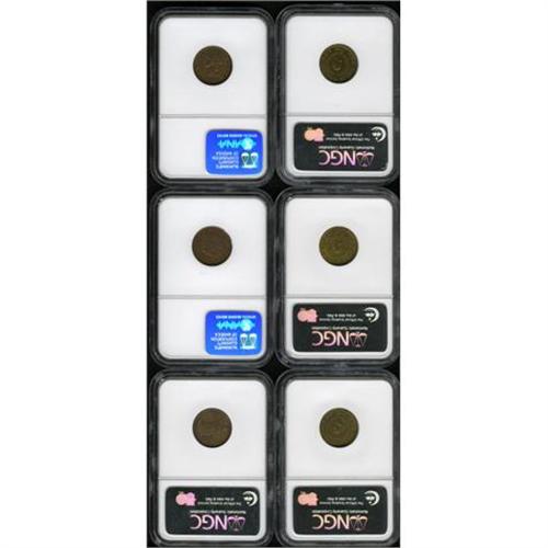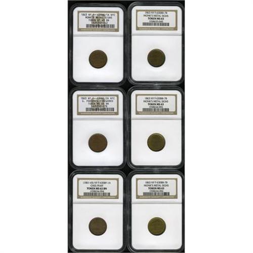 <B>New York Civil War Merchants Group Lot.</B></I> All from New York, NY. Consists of: an <B>1863 Monk's Metal Signs, Fuld-NY-630BB-7b, R.4, MS63 NGC,</B></I> three pieces, all nice and lustrous with muted mint red, should be designated Red and Brown; <B>1863 Monk's Metal Signs, Fuld-NY-630BB-1a, R.3, XF40 NGC; 1863 G. Parsons Fireworks, Fuld-NY-630BE-2a, R.3, MS64 Brown NGC;</B></I> and <B>(1861-65) Ches Pfaff, Fuld-NY-630BF-1a, R.2, MS62 Brown NGC.</B></I> The current market value should be about $200-$300.<BR><BR><b>Shipping:</b> Coins & Currency (<a target="_blank" href="http://www.heritageauctions.com/common/shipping.php">view shipping information</a>)