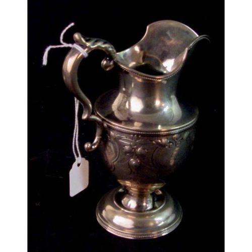 Stamped F. W. (Francis W.) Cooper New York, worked 1846-1851, coin silver, cream pitcher, both Repousse work as well as chasing, small dent where base stem attaches to flared out base, and an old solder joint where the base of the handle attaches to the body of the pitcher. The design has a sort of beaded pattern around the exterior of the base and rim of the spout, fancy monogram of S in a Victorian cartouche with an almost fish scale band around the top of the body of the pitcher. 5 3/4" tall by 4 1/4" from spout to handle. To be 150+ years old, this pitcher is in a remarkable state of preservation.