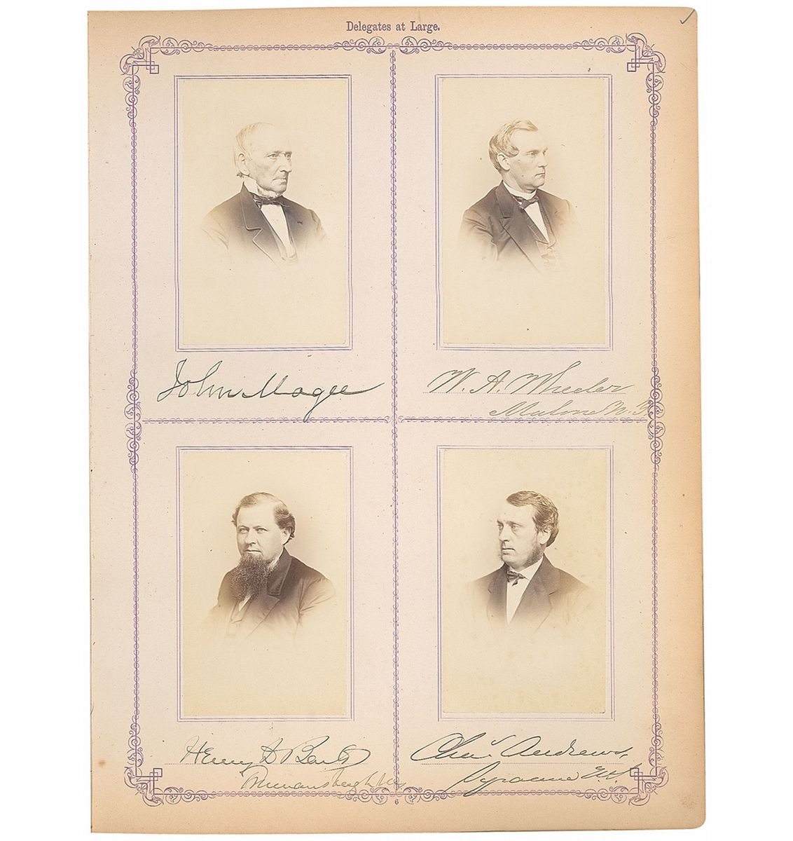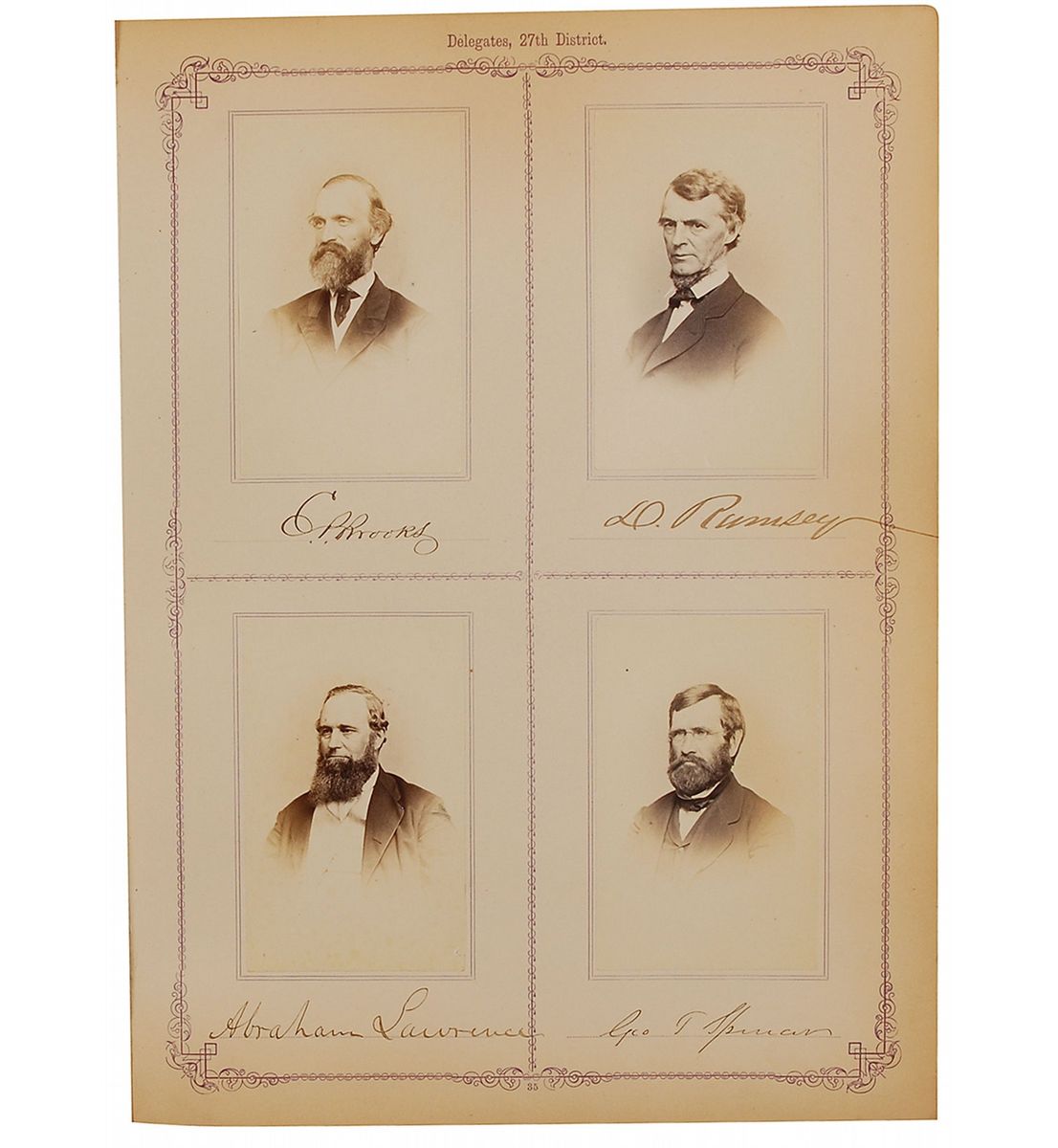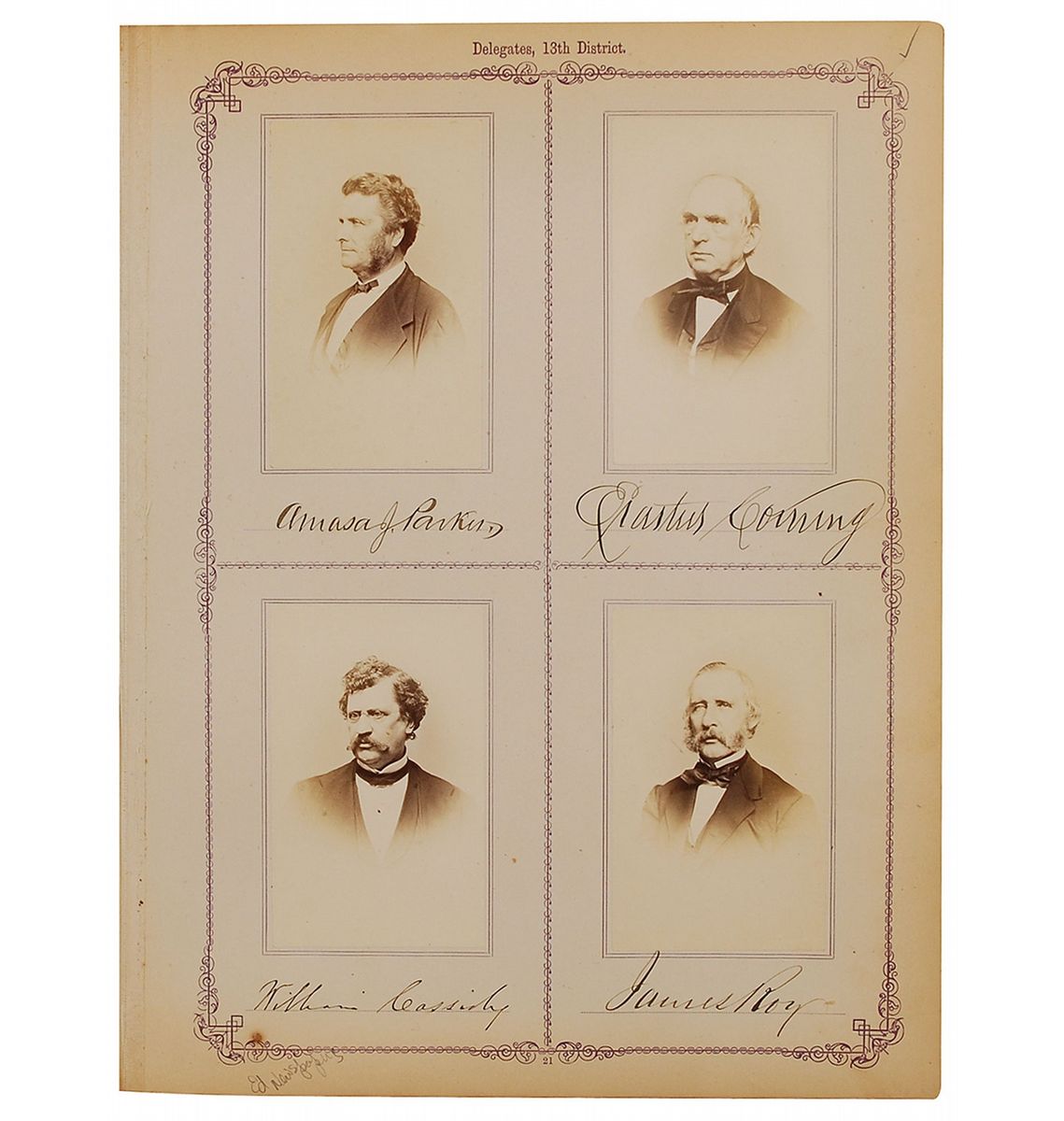 Original hardcover photo album of delegates to the New York Constitutional Convention of 1867–1868. Album measures 9.5 x 11, and contains 164 images inside, four to a page, almost all signed underneath their image by the delegate. Signers include: William Wheeler (who presided over the convention), Homer A. Nelson, Waldo Hutchins, William Evarts, George Opdyke, Erastus Cooke, Sanford Church, Erastus Corning, Horatio Ballard, and Hobart Krum. With mild rippling and pencil notations to pages, separated spine, and moderate rubbing and wear to covers, otherwise very good condition.