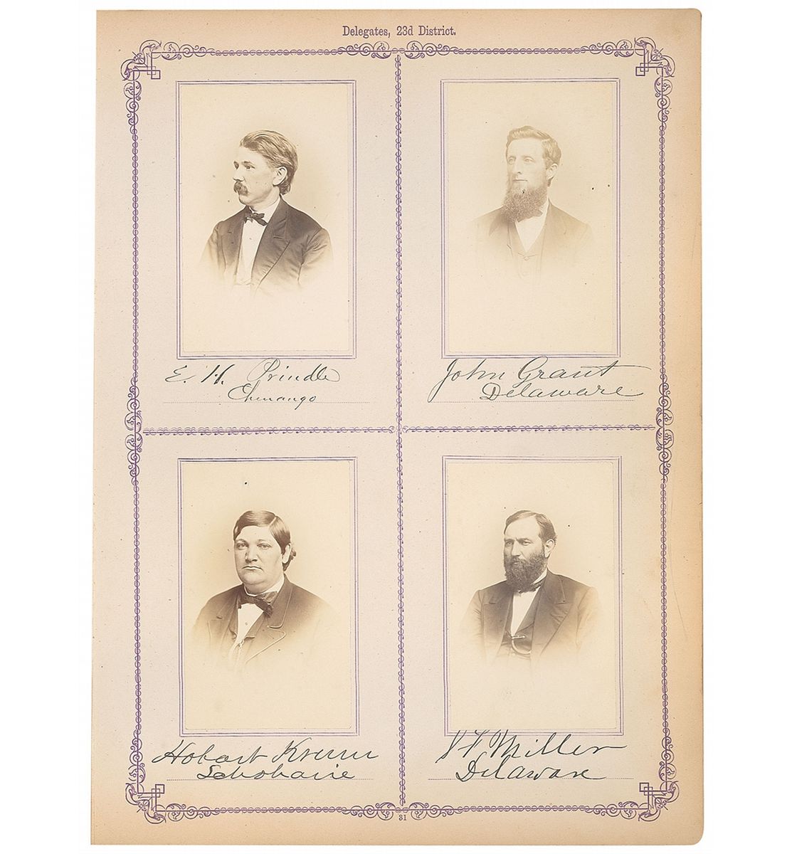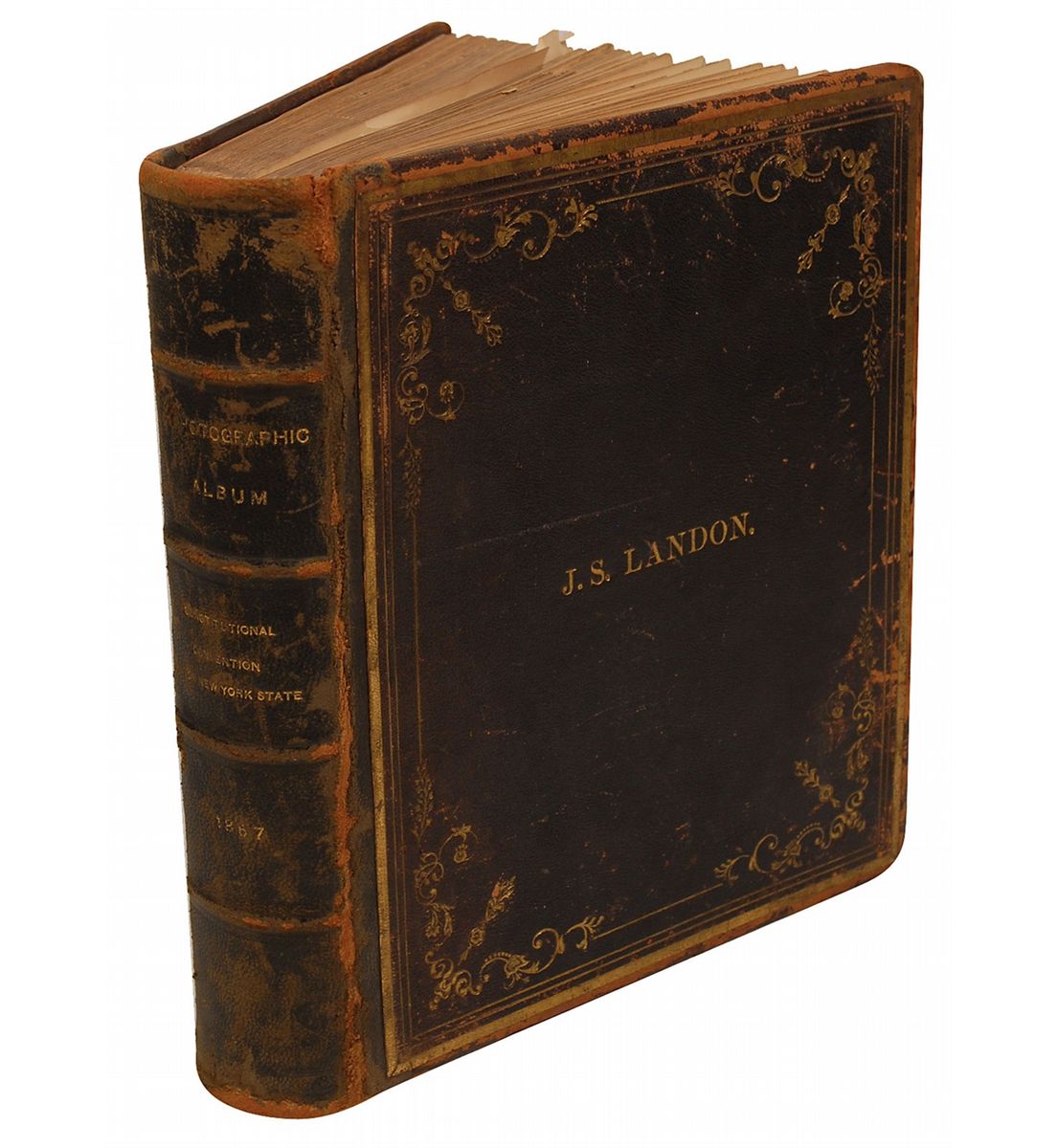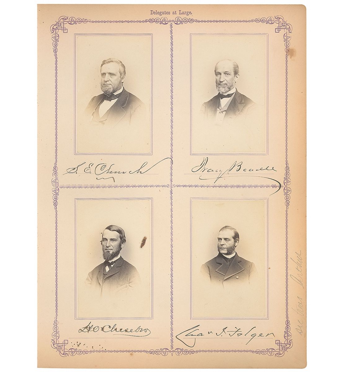 Original hardcover photo album of delegates to the New York Constitutional Convention of 1867–1868. Album measures 9.5 x 11, and contains 164 images inside, four to a page, almost all signed underneath their image by the delegate. Signers include: William Wheeler (who presided over the convention), Homer A. Nelson, Waldo Hutchins, William Evarts, George Opdyke, Erastus Cooke, Sanford Church, Erastus Corning, Horatio Ballard, and Hobart Krum. With mild rippling and pencil notations to pages, separated spine, and moderate rubbing and wear to covers, otherwise very good condition.
