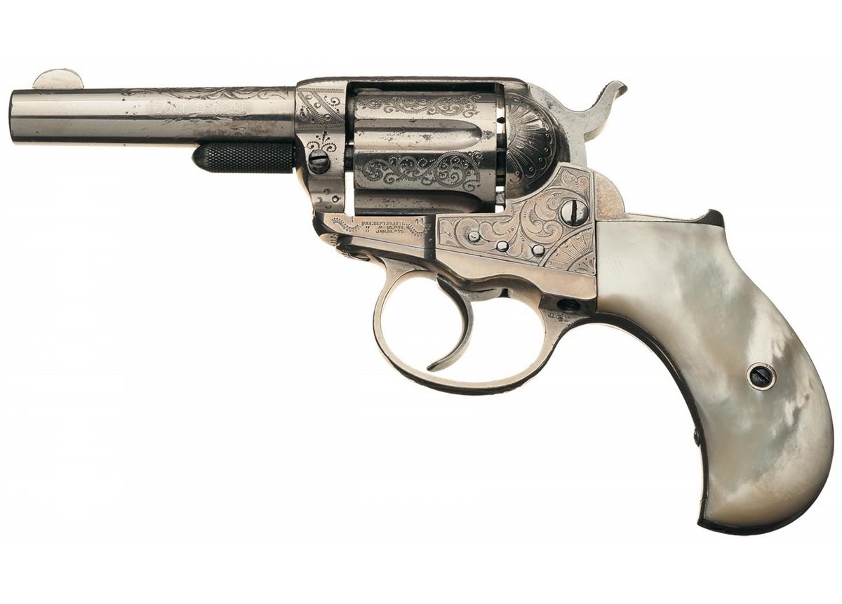 Very fine as Hartley & Graham embellished. The revolver retains 95% of the retailer applied nickel plated finish with minor wear on the top straps, edges of the frame, inside of the loading gate, sides of the hammer and face of the cylinder. The engraving and Colt factory markings remain crisp. The excellent pearl grips fit the revolver perfectly and show only minor handling wear. The action is crisp and functions well. This is an attractive example of a New York retailer engraved Colt Model 1877 DA Thunderer revolver.
