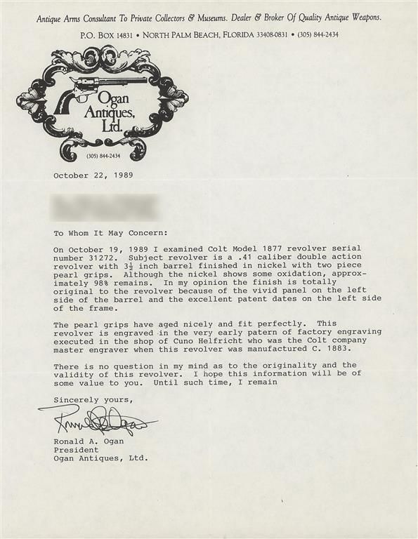 The factory letter describes the revolver as: "Caliber: .41/c, Barrel Length 3 1/2", Finish: Blue". The type of grips fitted to the revolver are not listed. The letter states that the revolver was shipped to Hartley & Graham in New York City on August 5, 1881. The revolver has a full nickel plated finish and is fitted with two-piece bird's head pearl grips. The barrel, frame, cylinder, trigger guard and back strap are decorated with a combination of Germanic scroll engraving on punch-dot background and zig-zag scrolls and borders. The top of the barrel is roll-stamped "COLT'S PT. F.A. MFG. Co./HARTFORD CT. U.S.A.". "COLT D.A. 41" is acid etched in an oval panel on the left side of the barrel. The Colt three date, three line patent marking is roll-stamped on the left side of the frame and "41 CAL" is stamped on the left shoulder of the trigger guard. The serial number "31272" is stamped on the bottom of the frame, trigger guard and back strap. The high quality engraving may have been executed by L.D. Nimschke or his shop; the combination of scrollwork and zig-zag borders is typical of Nimschke's work. Nimschke's shop engraved Colt revolvers for Hartley & Graham in the 1880s.