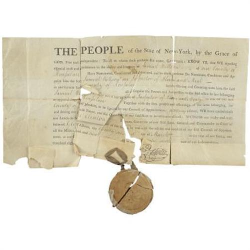<B>New York Governor George Clinton Document Signed</B></I> Partially printed, one page, 15.25" x 8.25", Albany, New York, March 22, 1802. Samuel Wilson is appointed "<I>Inspector of Flour and Meal in and for our said County of Rensselaer,</B></I>". Large Clinton signature above heavy wax New York State Seal on ribbon. Substantial splits along folds, some soiling, seal is heavily damaged and incomplete. <I>From the Collection of Henry E. Luhrs.</B></I><BR><BR><BR><BR><b>Shipping:</b> Flat Material, Small (<a target="_blank" href="http://www.heritageauctions.com/common/shipping.php">view shipping information</a>)