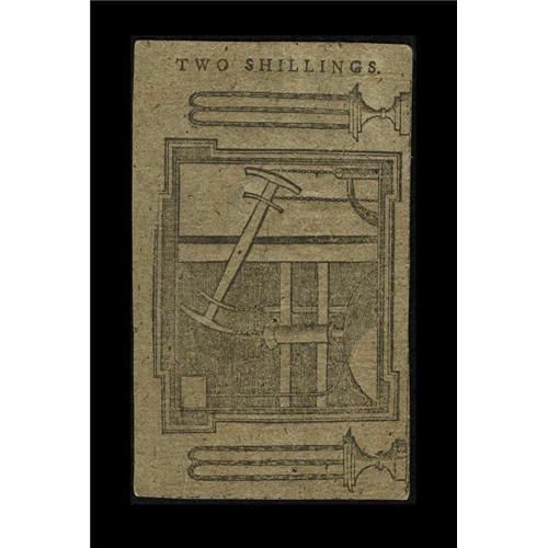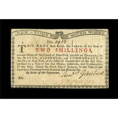 <B>New York January 6, 1776 (Water Works) 2s Choice New.</B></I> This is a pleasing example of one of the scarcer of the four New York Water Works issues. All of its original embossing is intact, and the margins are broad all the way around.<BR><BR><b>Shipping:</b> Coins & Currency (<a target="_blank" href="http://www.heritageauctions.com/common/shipping.php">view shipping information</a>)