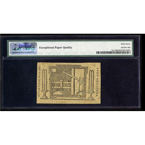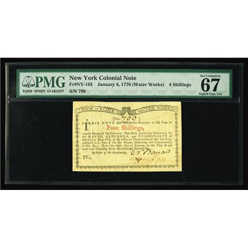 <B>New York January 6, 1776 (Water Works) 4s PMG Superb Gem Unc 67.</B></I> PMG has commented, "Exceptional Paper Quality" on this New York City Water Works Colonial Issue. These notes were printed on two separate pieces of paper that have been mounted together before printing. They are seldom seen without thin spots, pre-print folds or other problems due to this mounting. This one is pristine, well signed and simply perfect.