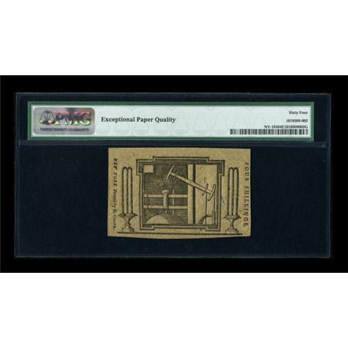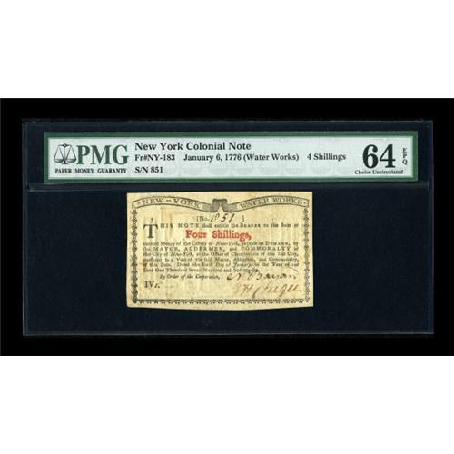 <B>New York January 6, 1776 (Water Works) 4s PMG Choice Uncirculated 64 EPQ.</B></I> This piece is as well centered and as fully margined as any Gem. The embossing could not be any bolder.<BR><BR><b>Shipping:</b> Coins & Currency (<a target="_blank" href="http://www.heritageauctions.com/common/shipping.php">view shipping information</a>)