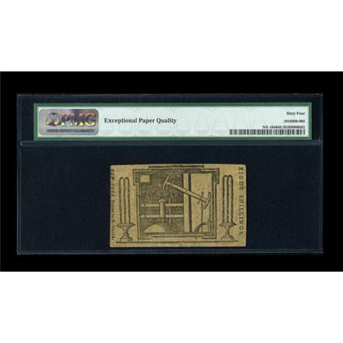<B>New York January 6, 1776 (Water Works) 8s PMG Choice Uncirculated 64 EPQ.</B></I> An interesting issue as two different stocks of paper were glued together for the paper supply of this issue. The face is of a bright paper, while the back had a dark coarser stock used. The signatures were done in red and black ink. This example remains quite bright.<BR><BR><b>Shipping:</b> Coins & Currency (<a target="_blank" href="http://www.heritageauctions.com/common/shipping.php">view shipping information</a>)
