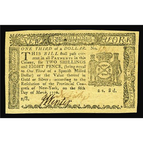New York March 5, 1776 $1/3 Choice New. The signatures New York March 5, 1776 $1/3 Choice New.