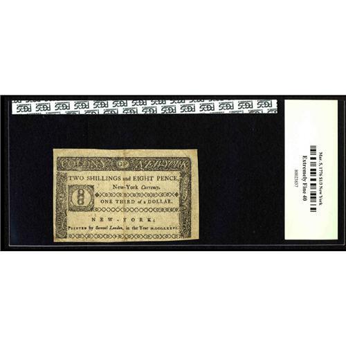 <B>New York March 5, 1776 $1/3 PCGS Extremely Fine 40.</B></I> Well printed and beautifully centered on both sides. Good-looking New York notes are not easily obtained and this one is sure to please some collector.