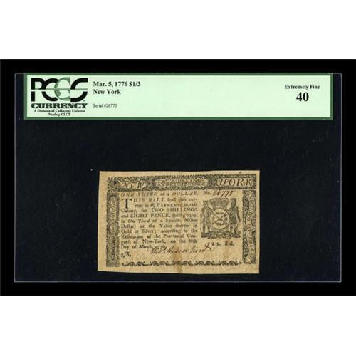 <B>New York March 5, 1776 $1/3 PCGS Extremely Fine 40.</B></I> This is a lightly handled note with a dark black ink signature.<BR><BR><b>Shipping:</b> Coins & Currency (<a target="_blank" href="http://www.heritageauctions.com/common/shipping.php">view shipping information</a>)