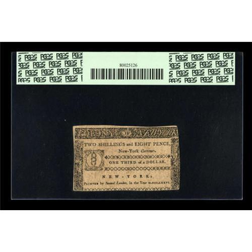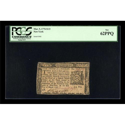 <B>New York March 5, 1776 $1/3 PCGS New 62PPQ.</B></I> We have only been able to offer a couple of higher graded examples over the years. This specimen is exceptional due to the vivid red signature and bold serial number.<BR><BR><b>Shipping:</b> Coins & Currency (<a target="_blank" href="http://www.heritageauctions.com/common/shipping.php">view shipping information</a>)