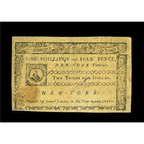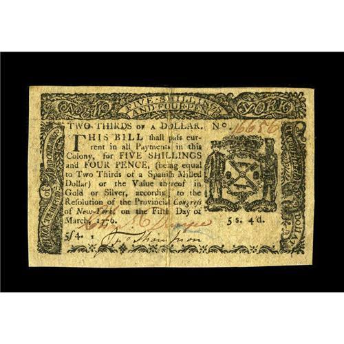 <B>New York March 5, 1776 $2/3 About New.</B></I> While not quite as nice as the other About New offered here, this piece is still attractive and separated from a New grade by a mere center fold and corner bend.<BR><BR><b>Shipping:</b> Coins & Currency (<a target="_blank" href="http://www.heritageauctions.com/common/shipping.php">view shipping information</a>)