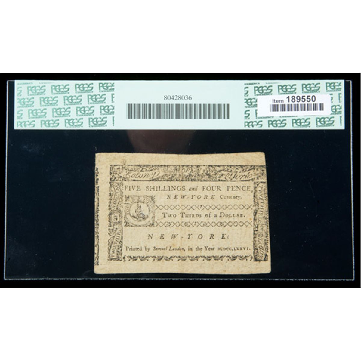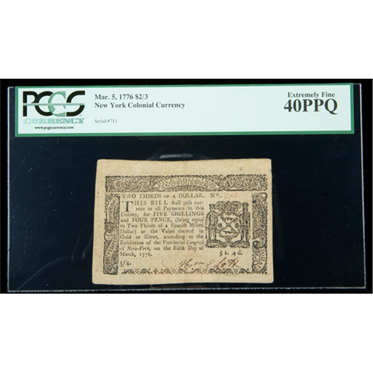 New York March 5, 1776 $2/3. PCGS Extremely Fine 40PPQ. . Fr-NY-190. A lovely example of this fractional denomination, with outstanding margins that frame the face design almost ideally. The back design is off center a hair to the right, with a small portion of the adjacent note on the sheet showing at left. About as nice an "XF" one is bound to find from this issue, which is often plagued by excessively toned or damaged paper or other flaws.