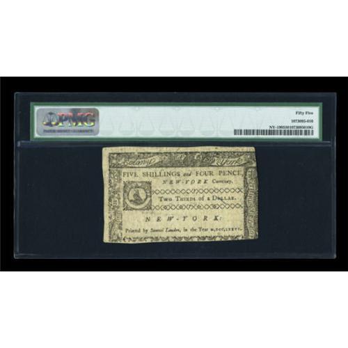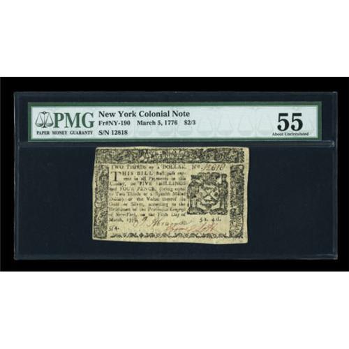 <B>New York March 5, 1776 $2/3 PMG About Uncirculated 55.</B></I> Deeply printed devices are noted on this piece. No single fold accounts for the grade, giving the note an overall appearance of a higher grade.<BR><BR><b>Shipping:</b> Coins & Currency (<a target="_blank" href="http://www.heritageauctions.com/common/shipping.php">view shipping information</a>)