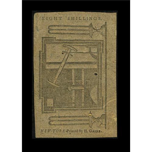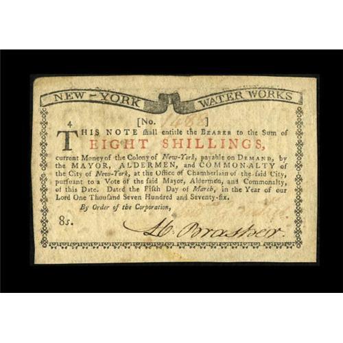 <B>New York March 5 ,1776 (Water Works) 8s New.</B></I> Most of the embossing remains. The upper left corner is a bit rounded.<BR><BR><b>Shipping:</b> Coins & Currency (<a target="_blank" href="http://www.heritageauctions.com/common/shipping.php">view shipping information</a>)