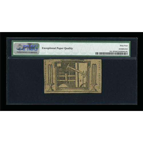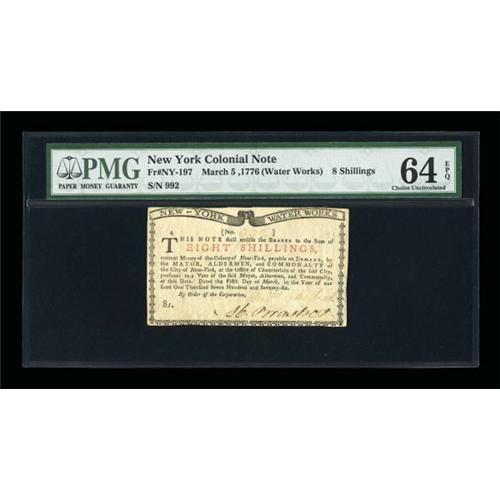 <B>New York March 5,1776 (Water Works) 8s PMG Choice Uncirculated 64 EPQ.</B></I> We have handled only one other nicer example of this pleasingly original denomination.<BR><BR><b>Shipping:</b> Coins & Currency (<a target="_blank" href="http://www.heritageauctions.com/common/shipping.php">view shipping information</a>)