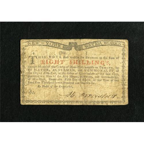 <B>New York March 5 ,1776 (Water Works) 8s Very Fine.</B></I> A moderately circulated Water Works note that has good margins and no problems.<BR><BR><b>Shipping:</b> Coins & Currency (<a target="_blank" href="http://www.heritageauctions.com/common/shipping.php">view shipping information</a>)