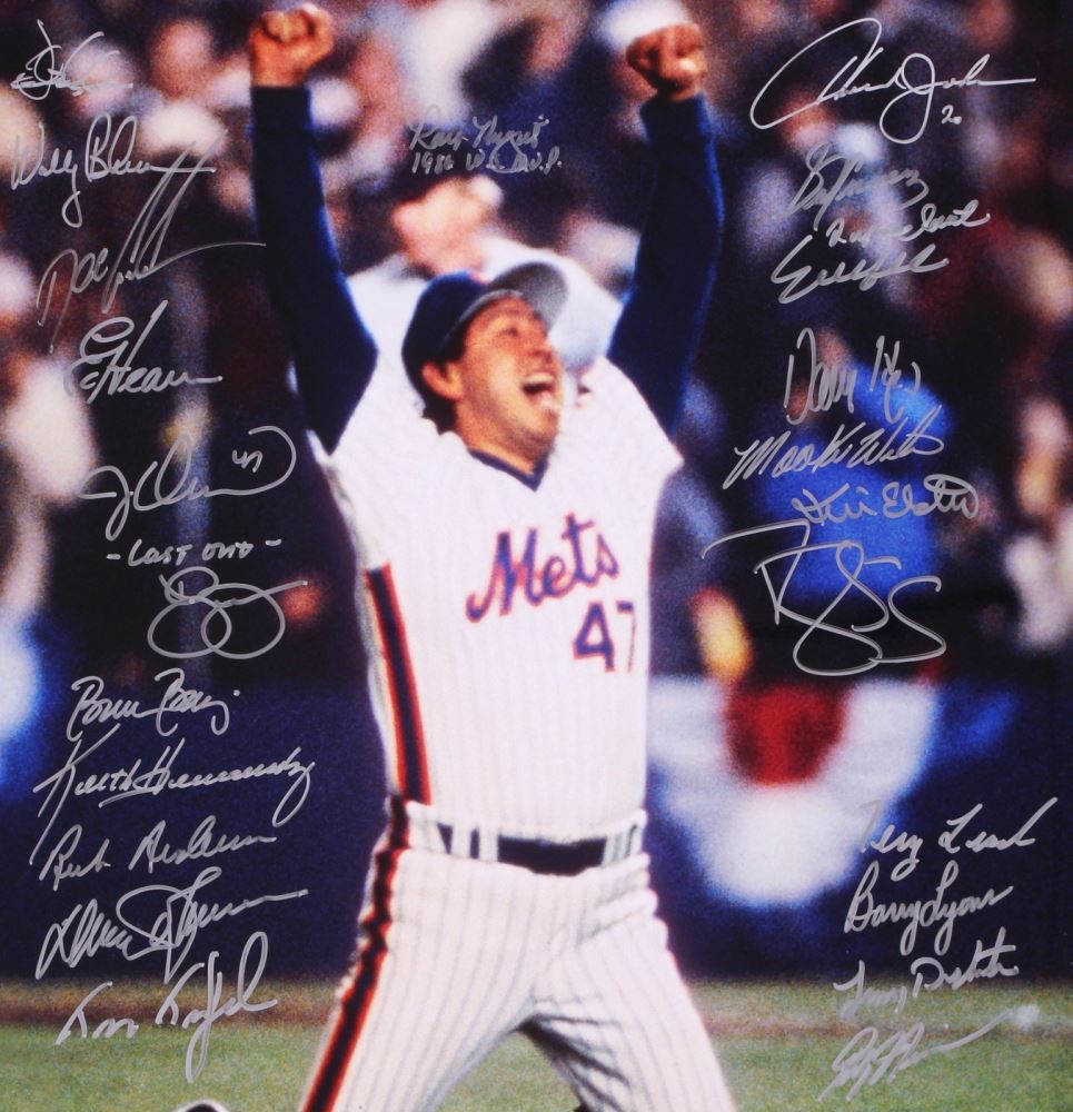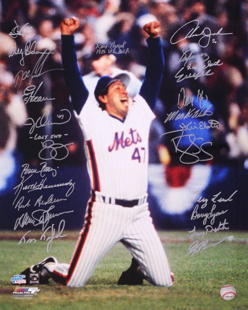 16" x 20" photo has been hand signed in silver paint pen by (23) members of the 1986 New York Mets World Series Champions. Autographs include Doc Gooden, Darryl Strawberry, Keith Hernandez, Ray Knight, Tim Teufel, Lenny Dykstra and others. The autograph includes a James  Spence Authentication (JSA) Auction House LOA for authenticity  purposes.