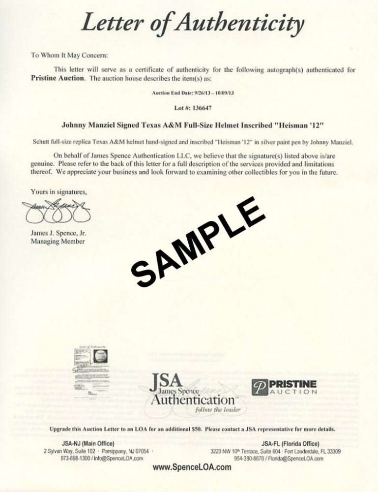 Returns: All items are shown and described to the best of our ability. Please ask any necessary questions before placing a bid. Items authenticated by an industry recognized third party authenticator may not be returned. Items accompanied by a Pristine Auction LOA can be returned for authenticity purposes if they have been reviewed and rejected by an acceptable authenticator. Acceptable authenticators are as follows: PSA/DNA, JSA, Global Authentics, or PAAS. All auction sales are final except in very limited circumstances (as described above or if a lot is grossly misrepresented). If winning bidder believes a lot was misrepresented he/she must contact us within 7 days of receipt of the lot with written explanation of the alleged gross error. If it is deemed that a gross error has occurred, it is the Buyer's responsibility to return the lot in question within seven (7) days of notice or evaluation.