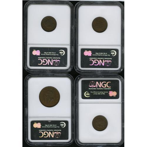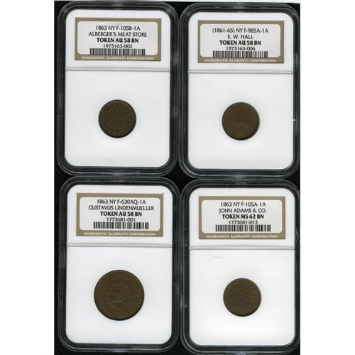 <B>New York NGC-Certified Patriotic Civil War Token Lot of 4.</B></I> The lot consists of: an <B>(1861-65) Fuld-NY-985A-1a, AU58 NGC; 1863 Fuld-NY-105B-1a, AU58 NGC; 1863 Fuld-NY-105A-1a, MS62 Brown NGC;</B></I> and an <B>1863 Fuld-NY-630AQ-1a, AU58 NGC.</B></I> A personal inspection is suggested.<BR><I>From The Troy Wiseman Collection.</B></I>