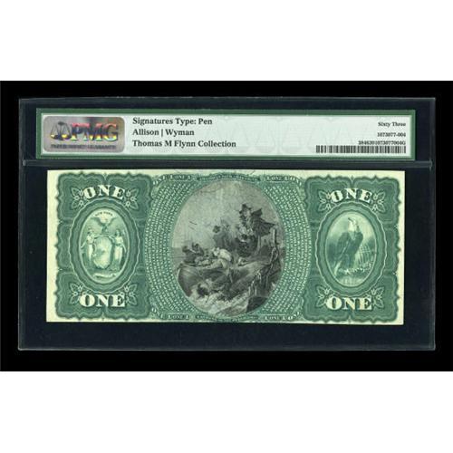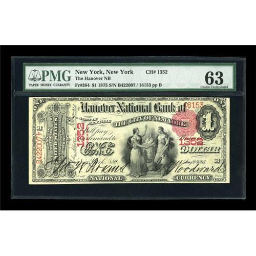 <B>New York, NY</B></I> - $1 1875 Fr. 384 <B>The Hanover NB</B></I> Ch. # 1352<BR> While this is not a terribly rare New York City bank, this piece, which is new to the census, blows away any First Charter we have ever seen or heard of from here, as the previous highest grade specimen only graded Very Fine. Sharp PMG <B>Choice Uncirculated 63,</B></I> with exceptionally bright colors and printing quality. <BR><I>From The Thomas M. Flynn Collection</B></I><BR><BR><b>Shipping:</b> Coins & Currency (<a target="_blank" href="http://www.heritageauctions.com/common/shipping.php">view shipping information</a>)