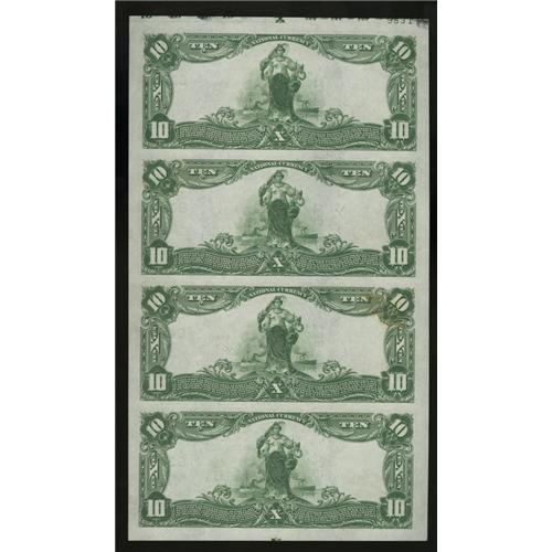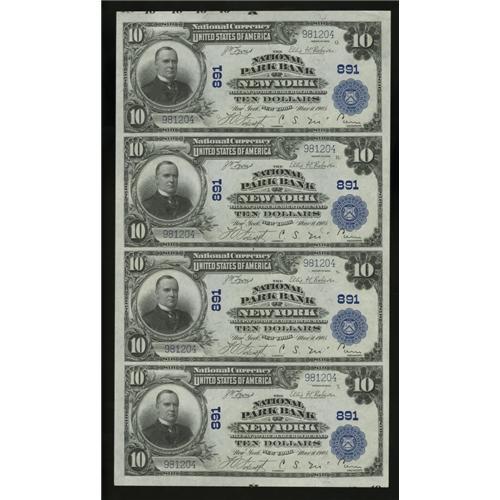 <B>New York, NY</B></I> - $10-$10-$10-$10 1902 Plain Back Fr. 624 <B>The National Park Bank</B></I> Ch. # 891 Uncut Sheet<BR>This is the "newer" of the two sheets we offer tonight. The back of the third note has a light orange spot approximately an inch and a half long. <B>Choice Crisp Uncirculated.</B></I><BR><BR><b>Shipping:</b> Coin/Currency (<a target="_blank" href="http://www.heritageauctions.com/common/shipping.php">view shipping information</a>)
