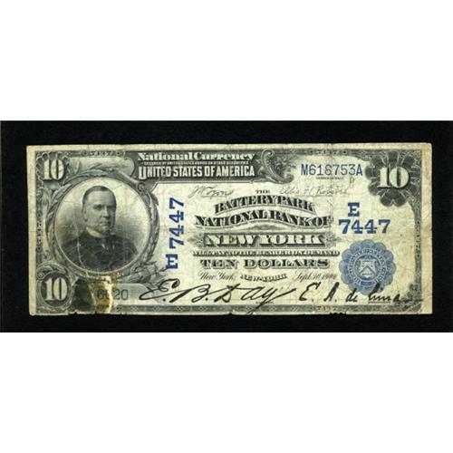<B>New York, NY</B></I> - $10 1902 Date Back Fr. 616 <B>The Battery Park NB</B></I> Ch. # (E)7447<BR> What this issue lacks in eye appeal, it makes up for in rarity. A mere five issues from this large size only issuer are reported in the electronic census. Only three pieces have ever been offered for auction, the last in 2002. The area below the portrait is damaged and was sloppily repaired. However, the majority of the note is whole and problem free. <B>Very Good.</B></I><BR><BR><b>Shipping:</b> Coins & Currency (<a target="_blank" href="http://www.heritageauctions.com/common/shipping.php">view shipping information</a>)