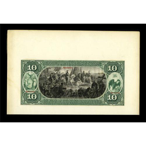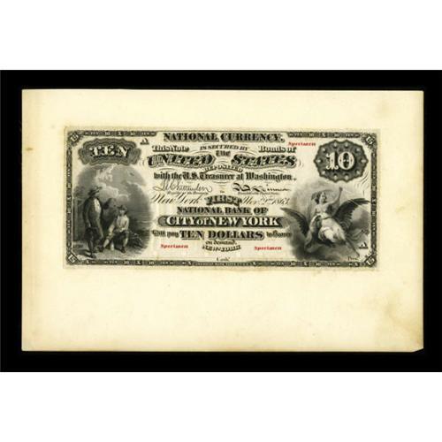 <B>New York, NY</B></I> - $10 Original Fr. 409 <B>The First NB</B></I> Ch. # 29 Face and Back Specimens<BR> These specimens have been printed on India paper and mounted on 8.75 by 5.75 inch card stock. Next they were included in a presentation book as the left edges will attest. Each has "Specimen" printed in red ink in three places. The face specimen also has six small punch cancels along the signature lines and the bottom right corner of the card stock is slightly shaved. Specimens from this era and especially National Bank Note specimens are nearly non-existent. <B>Crisp Uncirculated</B></I>.<BR><BR><b>Shipping:</b> Coins & Currency (<a target="_blank" href="http://www.heritageauctions.com/common/shipping.php">view shipping information</a>)