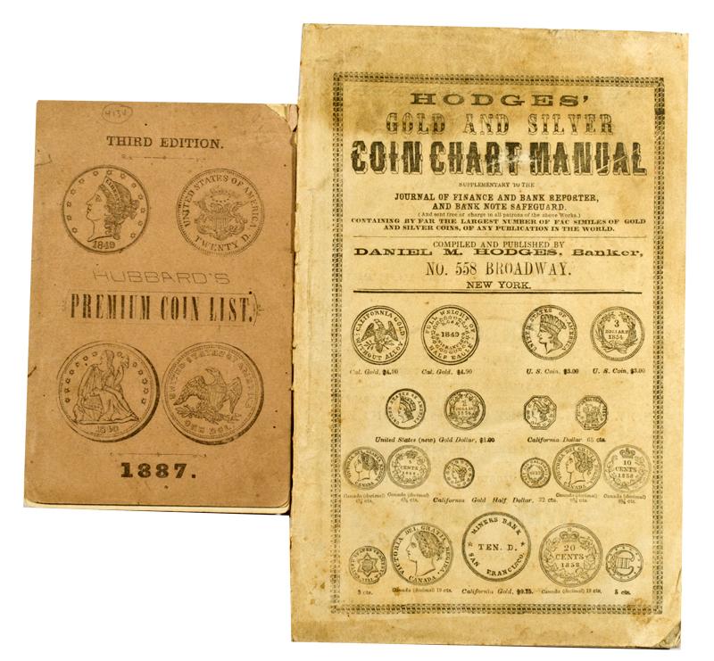 Lot of two. 1) Hodges' Gold and Silver Coin Chart Manual. Supplementary to the journal of finance and bank reporter, and bank note safe card, containing by far the largest number of facsimiles of gold and silver coins of any publication in the world. 49 pages total. This coin manual is important because on the cover and title page are illustrated a number of private gold coins. Fine. 2) Hubbard's Premium Coin list 1887. 24 pages. Approximately 5" x 67" soft bound coin catalog. There are vignettes of the 1849 US $20 and the 1840 US dollar coins on the front cover. It is a third edition. This book includes mostly rare US coinage including colonial issues. Fine Condition.