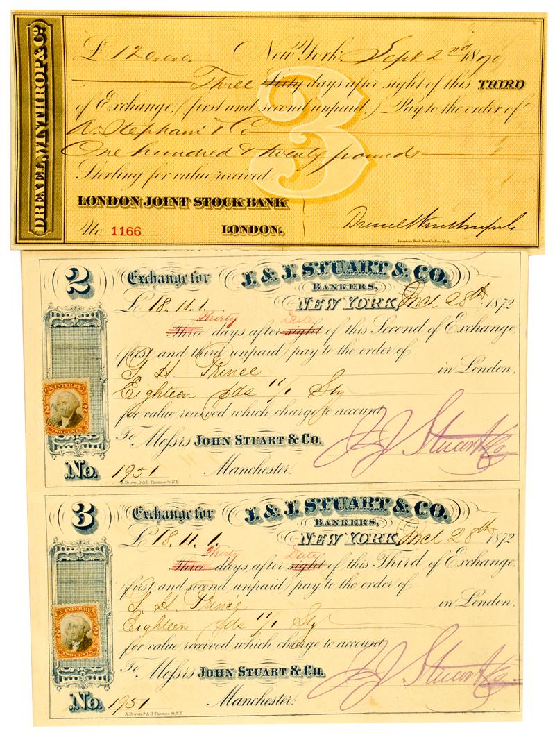 Lot of two: 1) Third of exchange No. 1166 issued Sept. 2, 1870 for 120 pounds. 9" x 4". 2) Uncut second and third exchanges, No. 1951 issued Mar. 28, 1872. For 18 pounds/sixty. J & J Stuart & Co. Bankers signed JJ Stuart in lavender ink. Two orange 2 cent cancelled revenue stamps at left, measures 8.5" x 8.25".