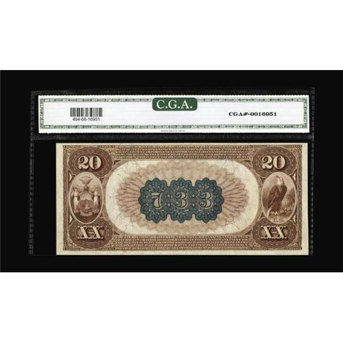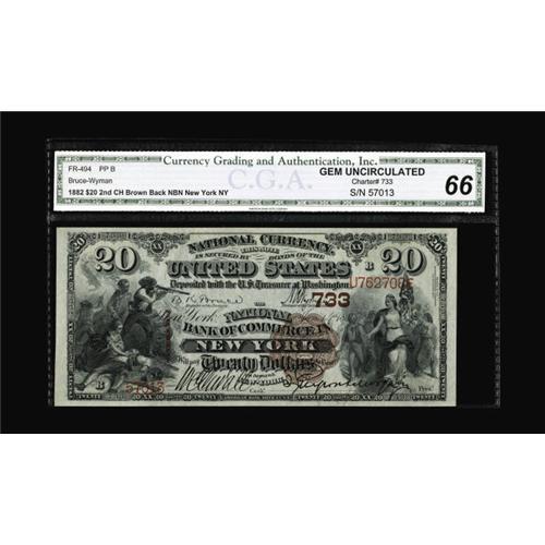 <B>New York, NY</B></I> - $20 1882 Brown Back Fr. 494 <B>The NB of Commerce</B></I> Ch. # 733<BR>A well centered and bright example which makes a perfect piece for any type set, especially considering the unusually high grade bestowed here by the certification agency, which has slabbed this note with a <B>CGA Gem Uncirculated 66</B></I> designation.