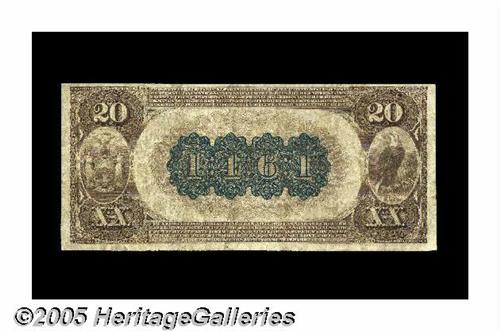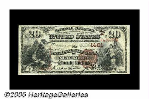<B>New York, NY</B></I> - $20 1882 Brown Back Fr. 496 <B>The National City Bank</B></I> Ch. #(E)1461<BR>A crispy and clean <B>Very Fine</B></I> with dark signatures. Likely to sell for somewhat more than its purely technical grade would imply.
