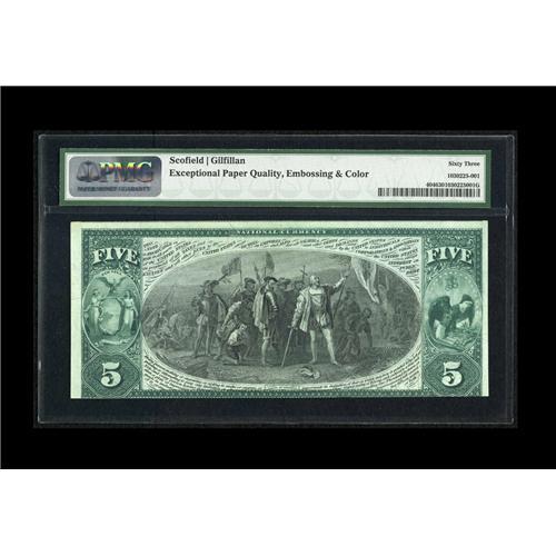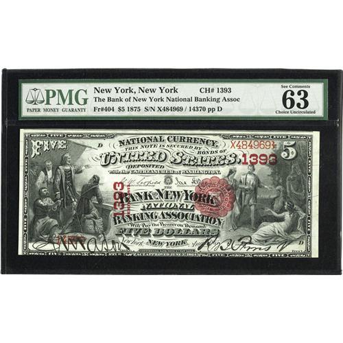 <B>New York, NY</B></I> - $5 1875 Fr. 404 <B>The Bank of New York National Banking Assoc</B></I> Ch. # 1393<BR>The seal color on Series 1875 Nationals is notoriously weak, this note however, features a bold seal and printed design elements. When this piece was cut from the sheet, little attention was paid to the lines and the note is tight at bottom and includes part of the top note in the upper margin. Were it cut a little better, this note may well have been Gem or better. <B>PMG Choice Uncirculated 63 Exceptional Paper Quality, Embossing, and Color.</B></I> This design type is listed as No. 29 in the book <I>100 Greatest American Currency Notes.</B></I><BR><I>From The Troy Wiseman Collection</B></I>