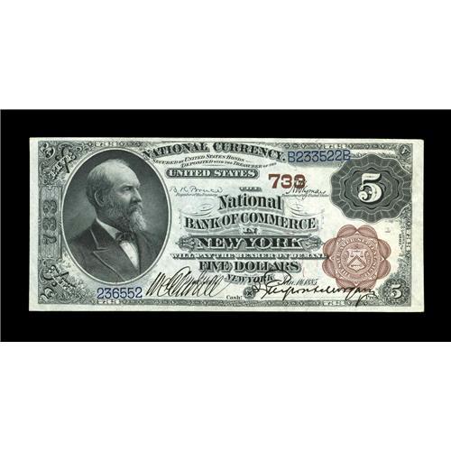 <B>New York, NY</B></I> - $5 1882 Brown Back Fr. 467 <B>The NB of Commerce</B></I> Ch. # 733<BR>A nice example for type, with good color and plenty of eye appeal. A few corner folds and a light fold separate this piece from a higher grade. <B>Extremely Fine-About Uncirculated.</B></I>