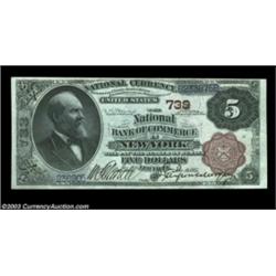 New York, NY - $5 1882 Brown Back Fr. 467 The NB of Commerce Ch. # 733Crackling fresh and with exceptionally vivid colors, a lovely $5 Brown Back which is a screaming gem but for some light handling marks and a close top margin. Choice Crisp Uncirculated. Important notice: Heritage usually auctions material at the rate of 200-250 lots per hour. On some occasions eBay Live bid software or the Internet may not be able to keep up with the pace of the auction. We recommend placing a realistic absentee bid now as insurance to avoid disappointment. Occasionally the auctioneer may eliminate or reject an eBay Live bid, and the auctioneer may also reopen a lot after the close of the eBay live bidding (usually because we missed an audience bid), and may reject your bid even if it shows you as the winning bidder. By bidding via eBay Live, you agree that Heritage may award the lot to another bidder at its sole discretion under the circumstances described above or any other reasonable circumstances. Also please note that all Heritage lots purchased through eBay Live carry a 20% Buyer's Premium. Please make sure you read the Terms and Conditions before you bid.
