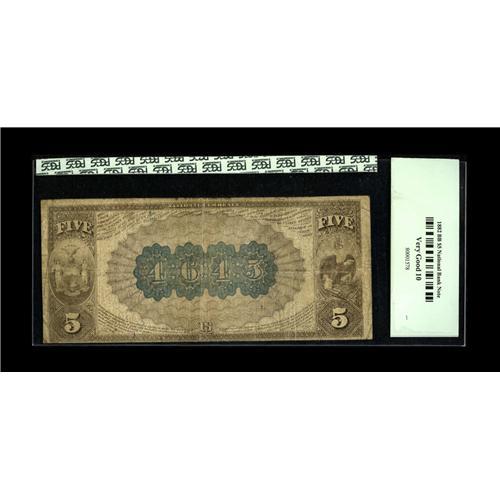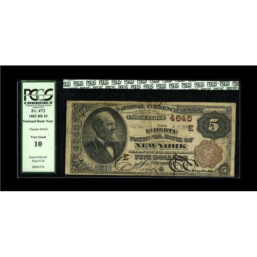 <B>New York, NY</B></I> - $5 1882 Brown Back Fr. 472 <B>The Liberty NB</B></I> Ch. # (E)4645<BR>Strong signatures are seen on this piece that has been graded <B>Very Good 10</B></I> by PCGS.<BR><BR><b>Shipping:</b> Coin/Currency (<a target="_blank" href="http://www.heritageauctions.com/common/shipping.php">view shipping information</a>)