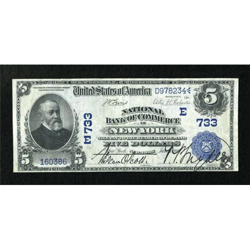 <B>New York, NY</B></I> - $5 1902 Date Back Fr. 590 <B>NB of Commerce</B></I> Ch. # (E)733<BR> This bright <B>Very Fine-Extremely Fine</B></I> example from a large "Big Apple" bank has bold printed signatures.<BR><BR><b>Shipping:</b> Coins & Currency (<a target="_blank" href="http://www.heritageauctions.com/common/shipping.php">view shipping information</a>)